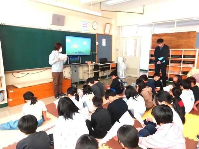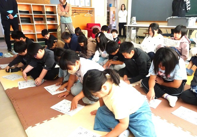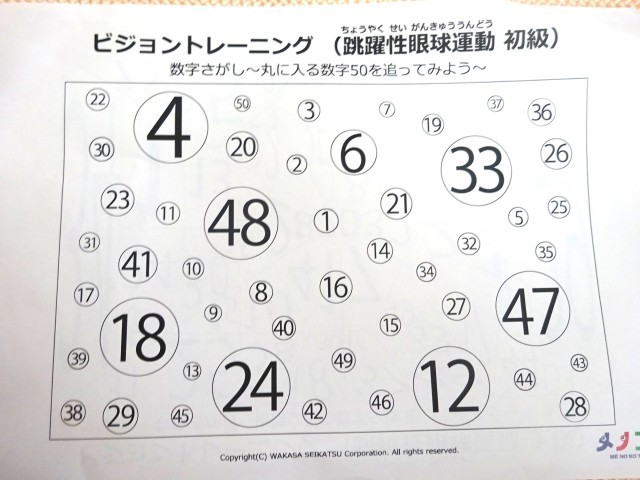 目の保健指導としてビジョントレーニングを行いました。紙に書かれた数字を順番にすばやくさがすものです。子ども達は、上下左右に目を動かして数字を速くさがしていました。ビジョントレーニングは、スポーツや学習に役立つ練習とされています。