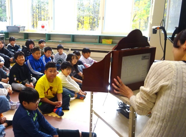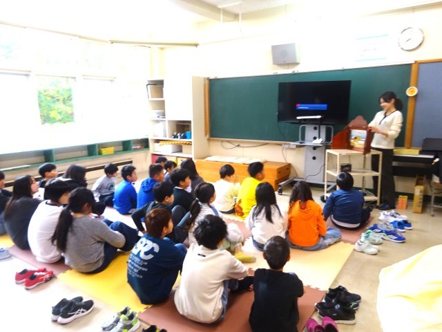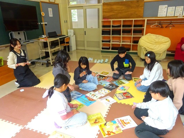 今日の読み聞かせ会では、図書館の司書さんが紙芝居や絵本を読んでくれました。子ども達は、紙芝居を真剣に聞いたり、かぼちゃに関する絵本ではおもしろい絵に笑ったりしながら、読み聞かせを楽しみました。休み時間には絵本カルタを楽しみました。