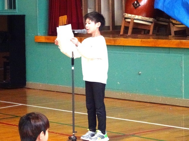 3学期始業式では、元気に校歌を歌ったあと、学級代表の児童から、「冬休みの思い出と3学期に頑張りたいこと」の発表がありました。みんなそれぞれ楽しい冬休みを過ごしたことと3学期に向けて目標達成を頑張りたいという気持ちが伝わってきました。校長先生からは「笑顔あふれる学校にしていきましょう。」というお話がありました。子ども達には、楽しみながら、自分の目標達成に向けて頑張る3学期にして欲しいと思います。