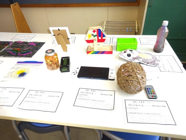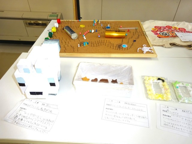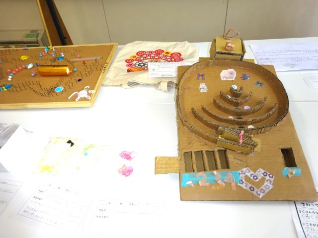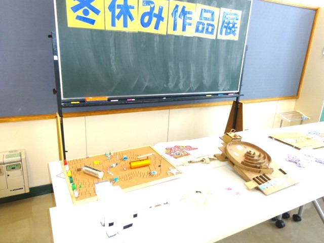 冬休みに子ども達が作成したものの作品展が行われました。みんなのアイデアがいかされていてとても感心しました。子ども達も友達がつくった作品をみながら、よい所をあげあっていました。