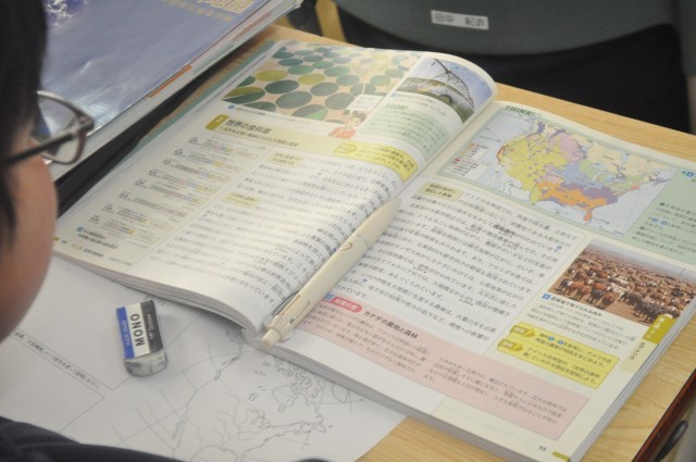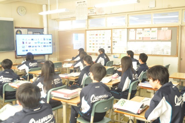 中学1年生の社会科では、先生と生徒の対話を重ねながら、雄武町とアメリカの肉牛生産の特徴を整理しました。放牧中心の雄武町と、飼料を大規模に生産して効率的に牛を育てるアメリカの違いについて意見が交わされ、モニターに映る牧場の様子も手がかりに考えを深めました。生徒は、身近な地域と世界を比べる中で食料生産の仕組みに気付き、それぞれが自分なりの視点で学びをまとめることができました