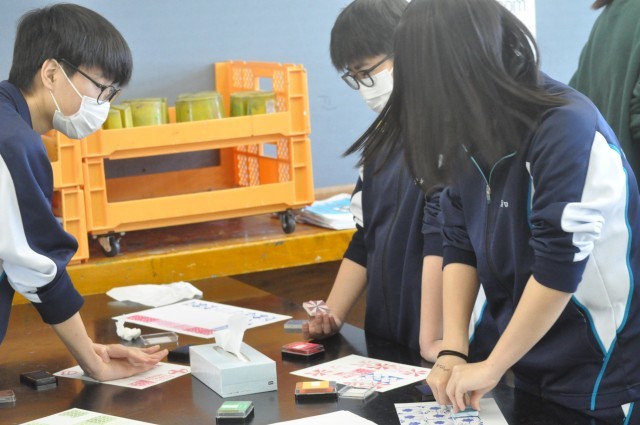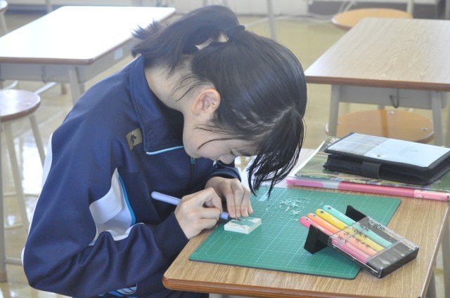 1年生の美術の授業では、「広がる模様の世界」をテーマに、消しゴムスタンプの原案づくりから作品制作、そして疑似オークション形式による作品評価までを見通した学習に取り組みました。