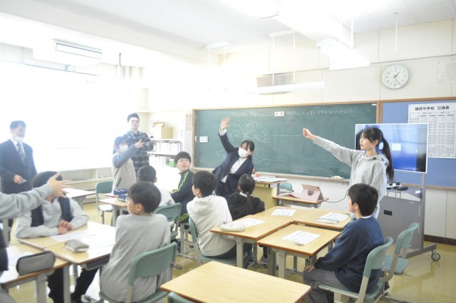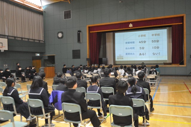体験授業後は体育館で、中学1年生による学校紹介が行われ、授業時間の違いや学校生活、行事や部活動について、班ごとにスライドを使って発表しました。一つ先輩としての言葉は、小学生にとって分かりやすく安心感のある内容となりました。