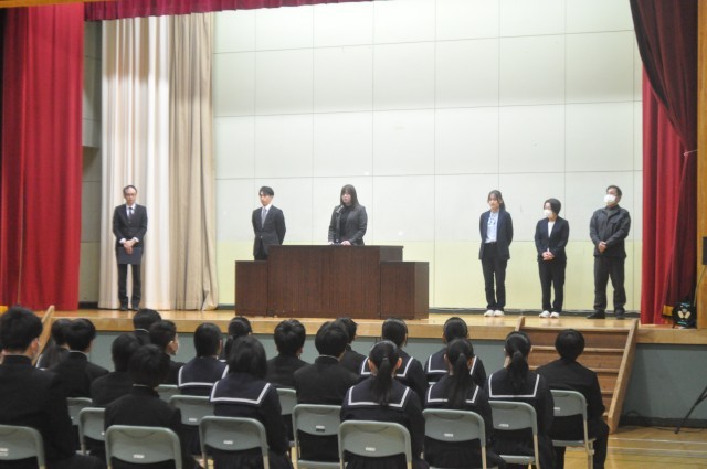 続いて行われた離任式では、5名の先生方よりご挨拶をいただきました。お一人お一人の言葉には、生徒への思いや学校での思い出が込められており、生徒たちも真剣な表情で耳を傾けていました。